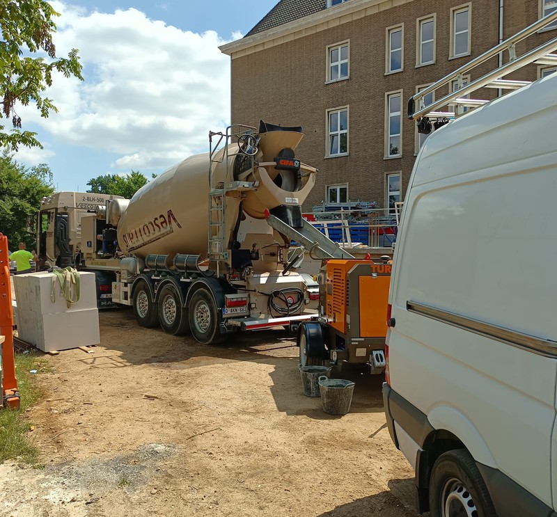 Levering van beton en betonpompen in heel Antwerpen en Limburg, ook op moeilijk bereikbare plaatsen dankzij compacte pompen.