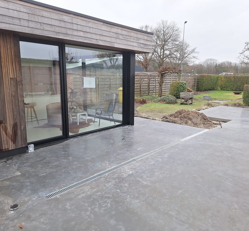 Een terras in gepolierd beton zorgt voor een strakke, duurzame en onderhoudsvriendelijke buitenruimte. Ideaal voor jarenlang comfort en een moderne uitstraling.
